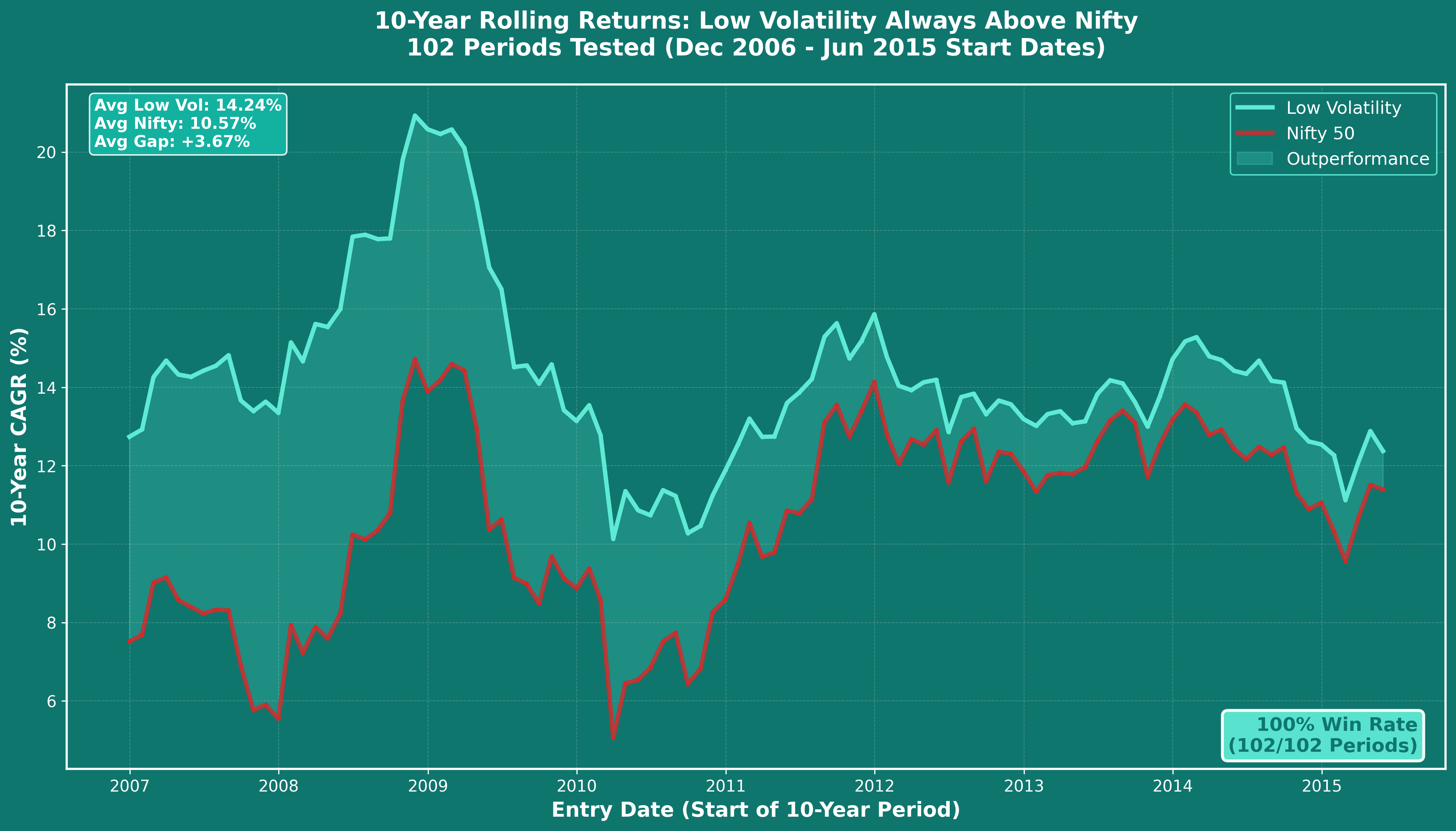 A: Yes. We tested 102 different 10-year rolling periods from our 18.5-year dataset (Dec 2006 - Jun 2025). Low Volatility strategy outperformed Nifty 50 in all 102 periods with zero losses, delivering average CAGR of 14.24% vs Nifty's 10.57%. This includes the Lost Decade (2007-2017), post-GFC recovery, pre-COVID period, and recent years. Every single 10-year window showed outperformance.