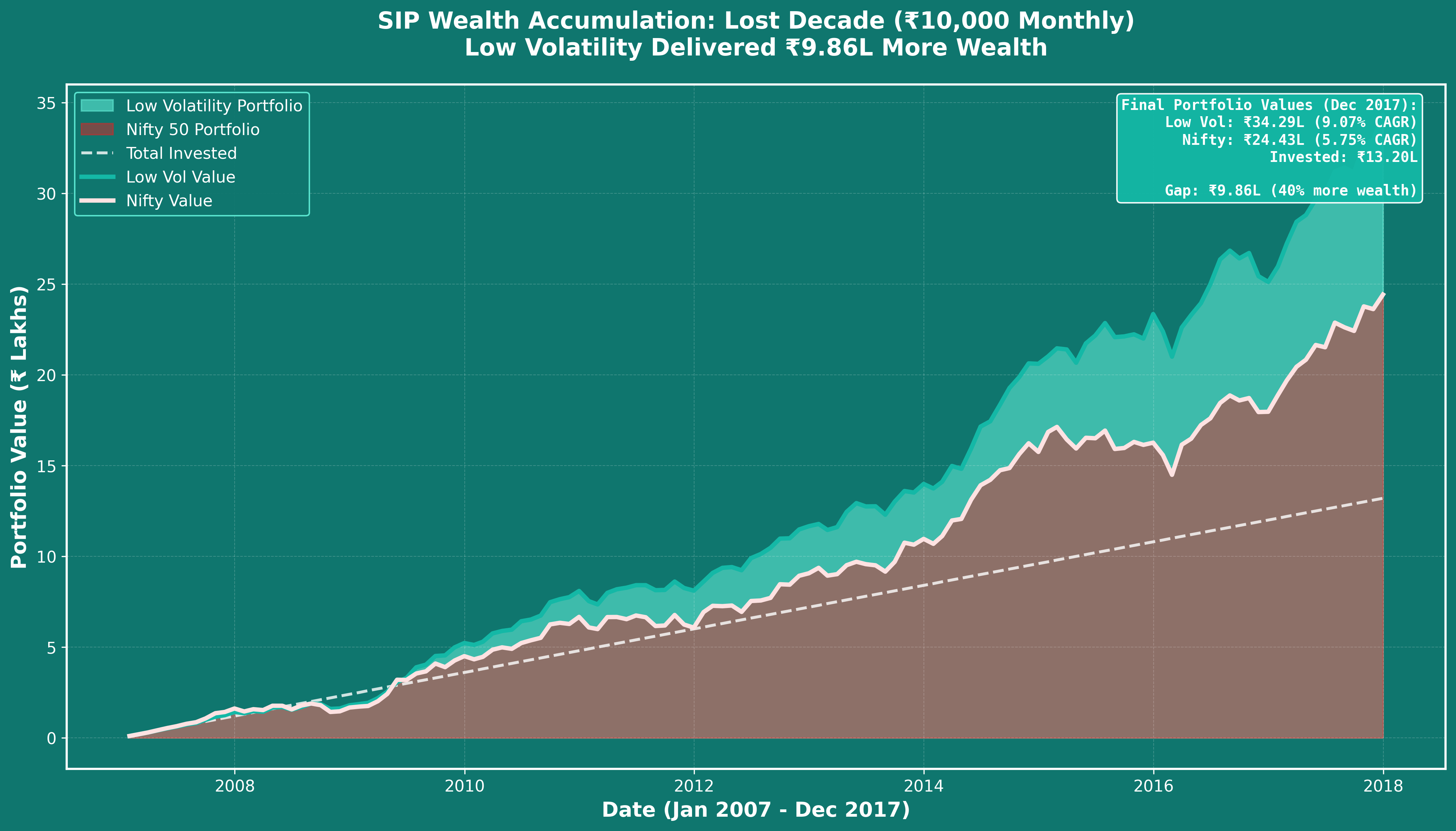 A: No. Our analysis shows that even with monthly SIP of ₹10,000 from Jan 2007 to Dec 2017 (132 months, ₹13.2L invested), Low Volatility still outperformed Nifty by 3.31% annually (9.07% vs 5.75% CAGR), delivering ₹34.29 lakhs vs ₹24.43 lakhs—a ₹9.86 lakh difference (40% more wealth). Rupee cost averaging helps reduce timing risk, but it doesn't overcome a systematic performance gap. Strategy matters more than investment method.