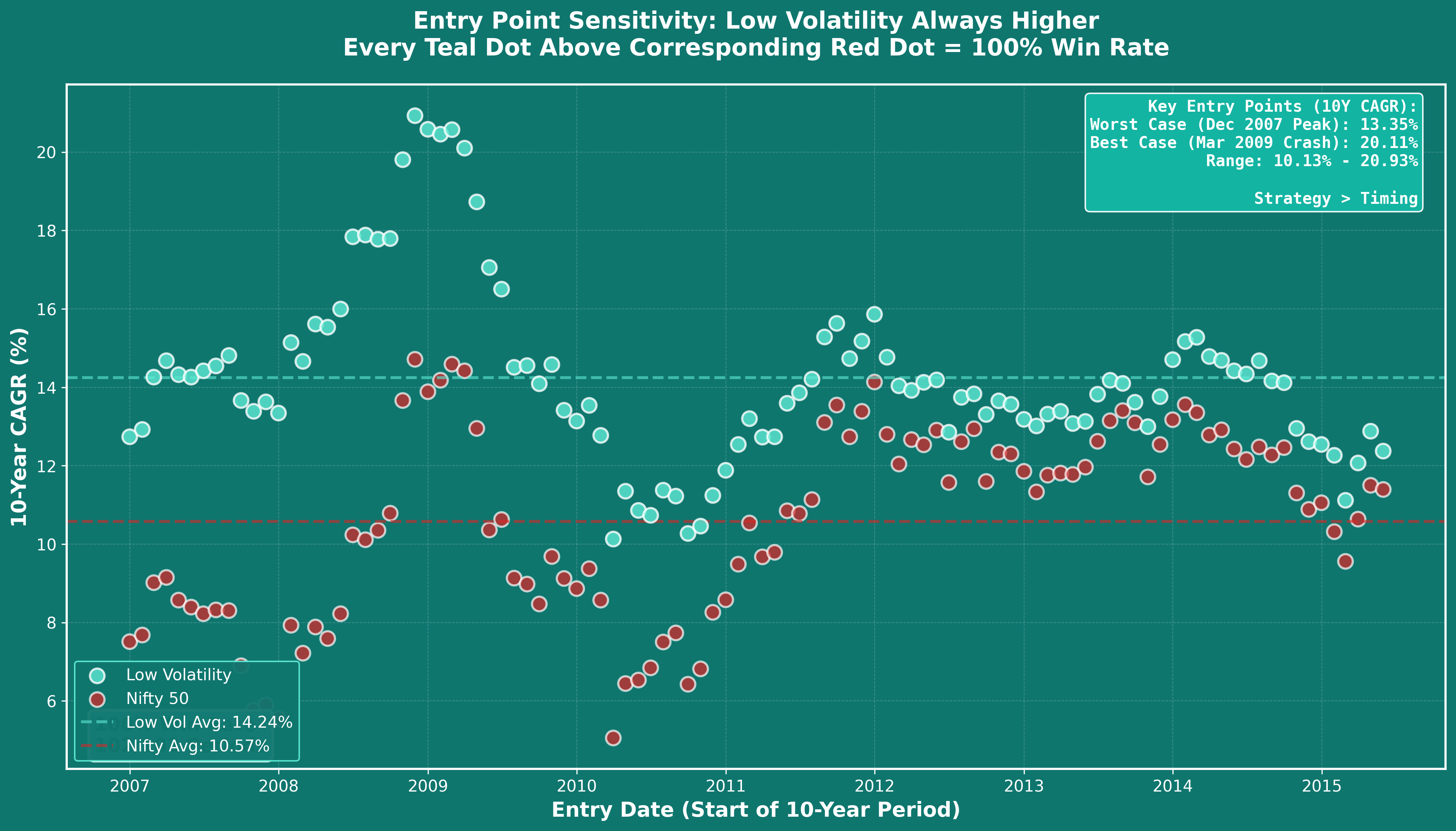 A: Even investing at the worst time (Dec 2007 market peak, right before 2008 crash), Low Volatility delivered 13.35% CAGR over the next 10 years while Nifty managed only 5.54%. A ₹10 lakh investment would have grown to ₹35 lakhs (Low Vol) vs ₹17.15 lakhs (Nifty). Strategy quality matters more than entry timing—the worst Low Vol entry still delivered higher returns than many "good timing" Nifty entries.